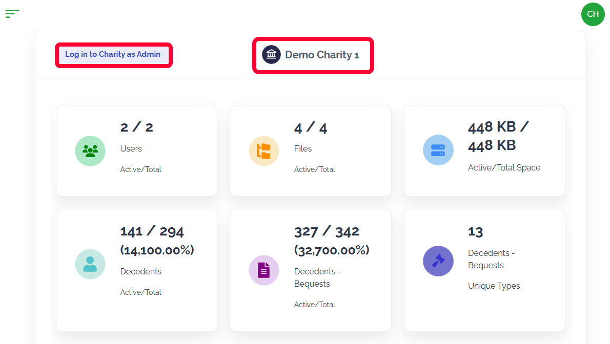 The Super Admin Dashboard provides an overview of all the charities in your organization. Each charity will have a brief overview of users, files, decedents, and bequests. As a Super Admin you can log into different charities as an Admin user. For more information see the article Log in to a Charity.