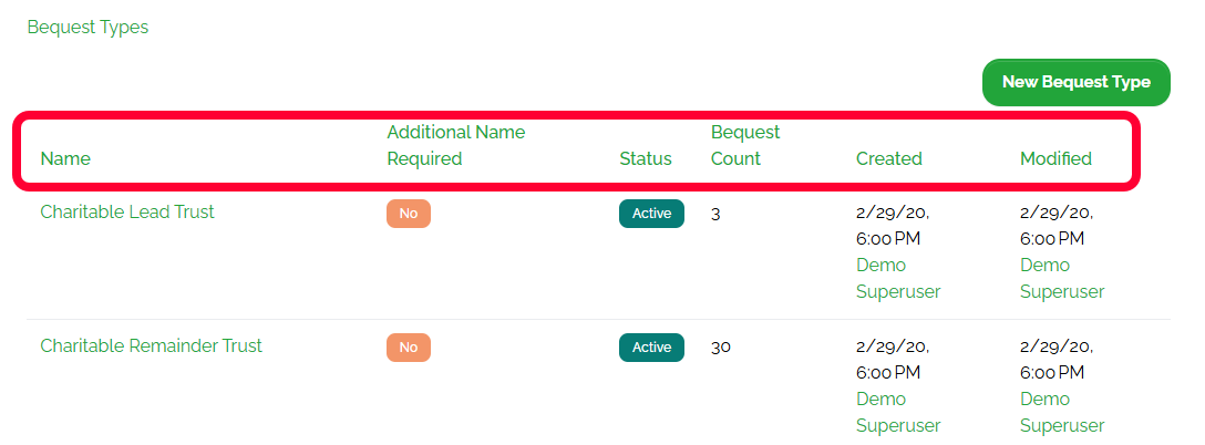 A list of all existing bequest types will be displayed. By default, bequest types will display in alphabetical order based on their Name.