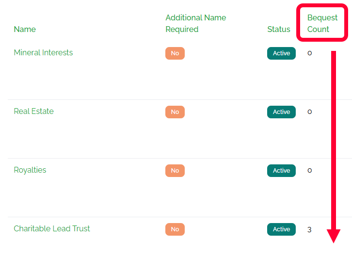 In the example below, the Bequest Count column was clicked, so the bequest types are now sorted from the lowest count to the highest. If you click Bequest Count again, the bequest types will be sorted from the highest number of files to the lowest.