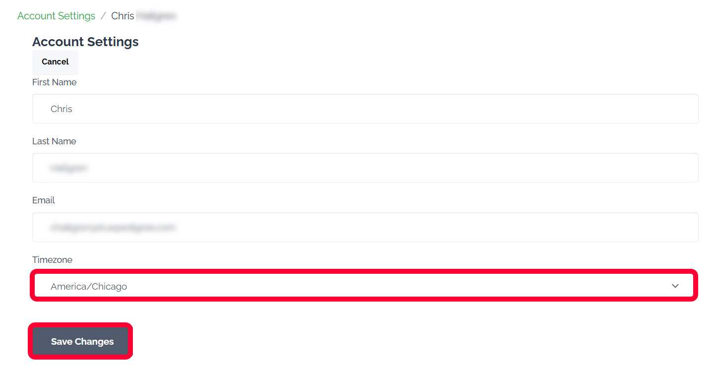 The Account Settings page will open. Use the Timezone dropdown to change the zone as needed. Click Save Changes at the bottom to keep your changes.