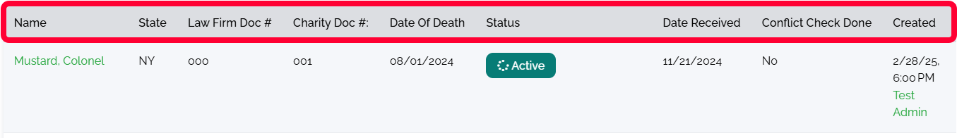 You can also sort the decedents that appear on the page. Click the column name to sort the decedents by that column.