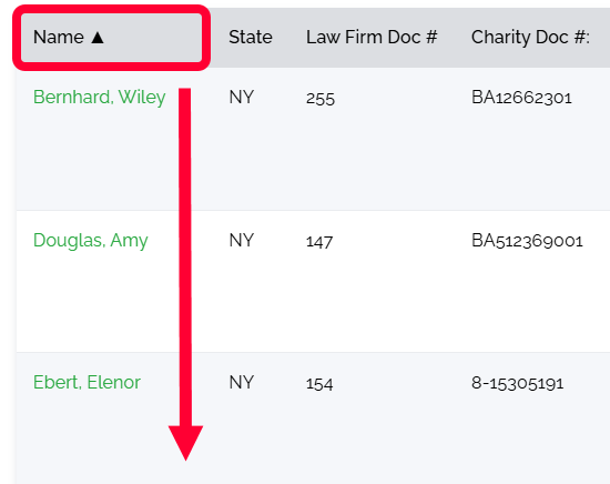 In the example below, Name was clicked. The decedents are now sorted from A-Z by their last name. If you click Name again, the decedents will be sorted from Z-A by their last name.