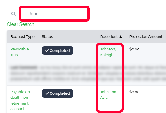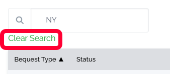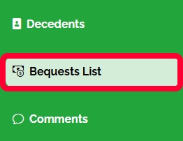 The Bequests page will open. You can search for a bequest with the search bar in the top left. You can search using the bequest type or decedent name. Hit the Enter key to search, results will show below.