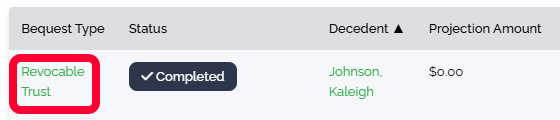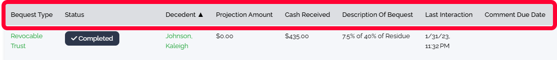 You can also sort the bequests that appear on the page. Click the column name to sort the bequests by that column.