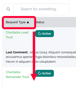 In the example below, Bequest Type was clicked. The bequests are now sorted from A-Z by the type name. If you click Bequest Type again, the bequests will be sorted from Z-A by their type name.