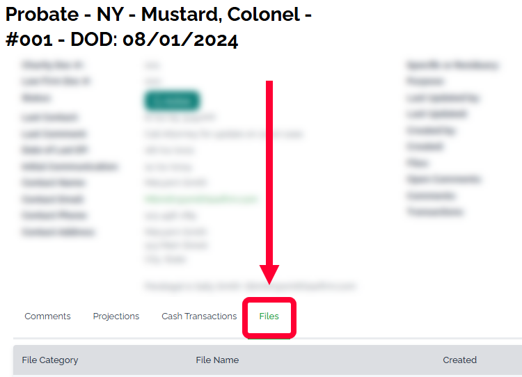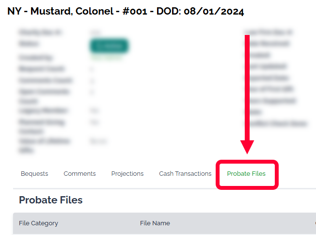 You can also find the files in the decedent profile. Click the Files tab for the appropriate bequest. For example, the files for a probate bequest will be under the Probate Files tab.