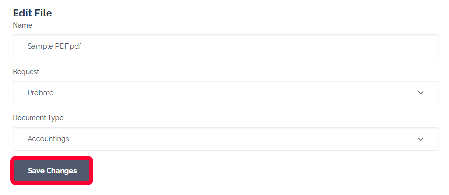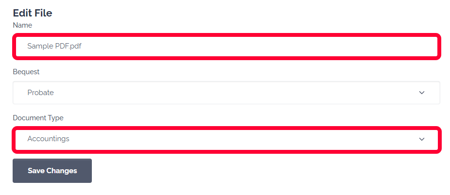 The Edit File window will open. You can update the Name of the file and the Document Type.