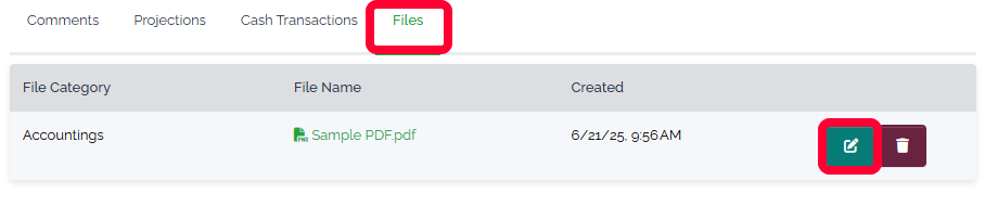 To update or reassign a bequest file, click the Files tab. Locate the desired file and click the pencil icon to the right.